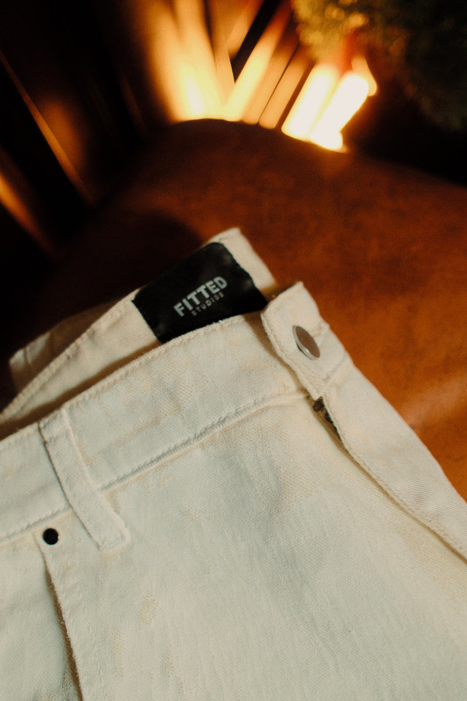 These carpenter pants merge utilitarian tradition with hand-finished artistry. Cut from sturdy cotton canvas in a warm off-white tone, the relaxed silhouette is detailed with functional pocketing, reinforced seams, and a painter’s hammer loop. Each pair is individually hand-painted in San Jose with a crackle effect, creating a unique surface texture that feels both worn-in and expressive.